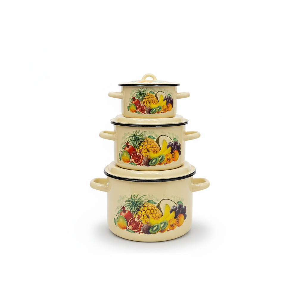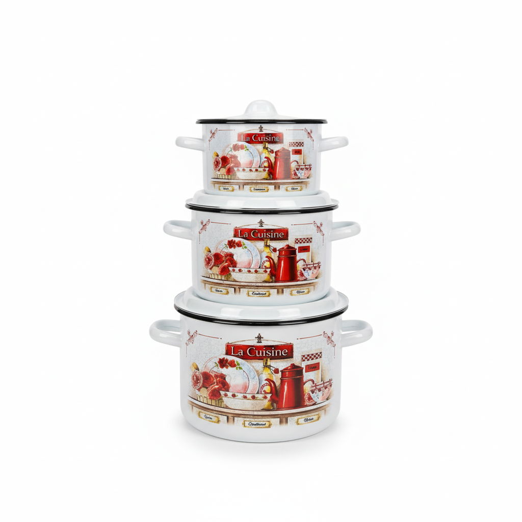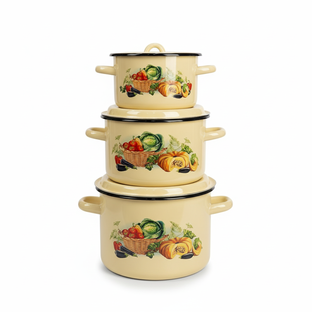 سرویس قابلمه ۶ پارچه لعابی ساخت روسیه با سایزهای ۱.۵، ۳ و ۴.۵ لیتر. بسیار ضخیم، بادوام، قابل استفاده روی شعله مستقیم و ماشین ظرفشویی، بدون تغییر رنگ و طرح.