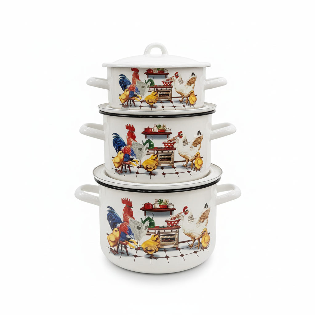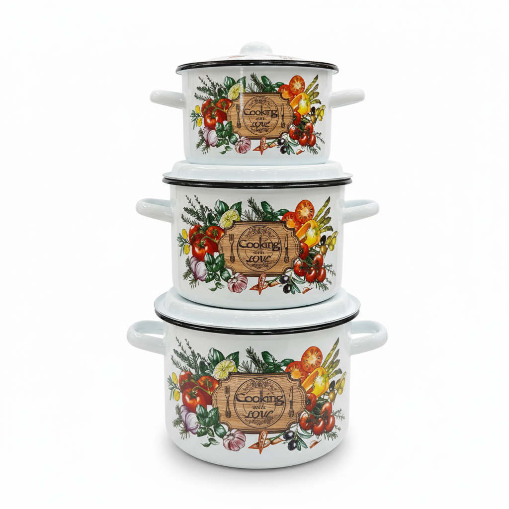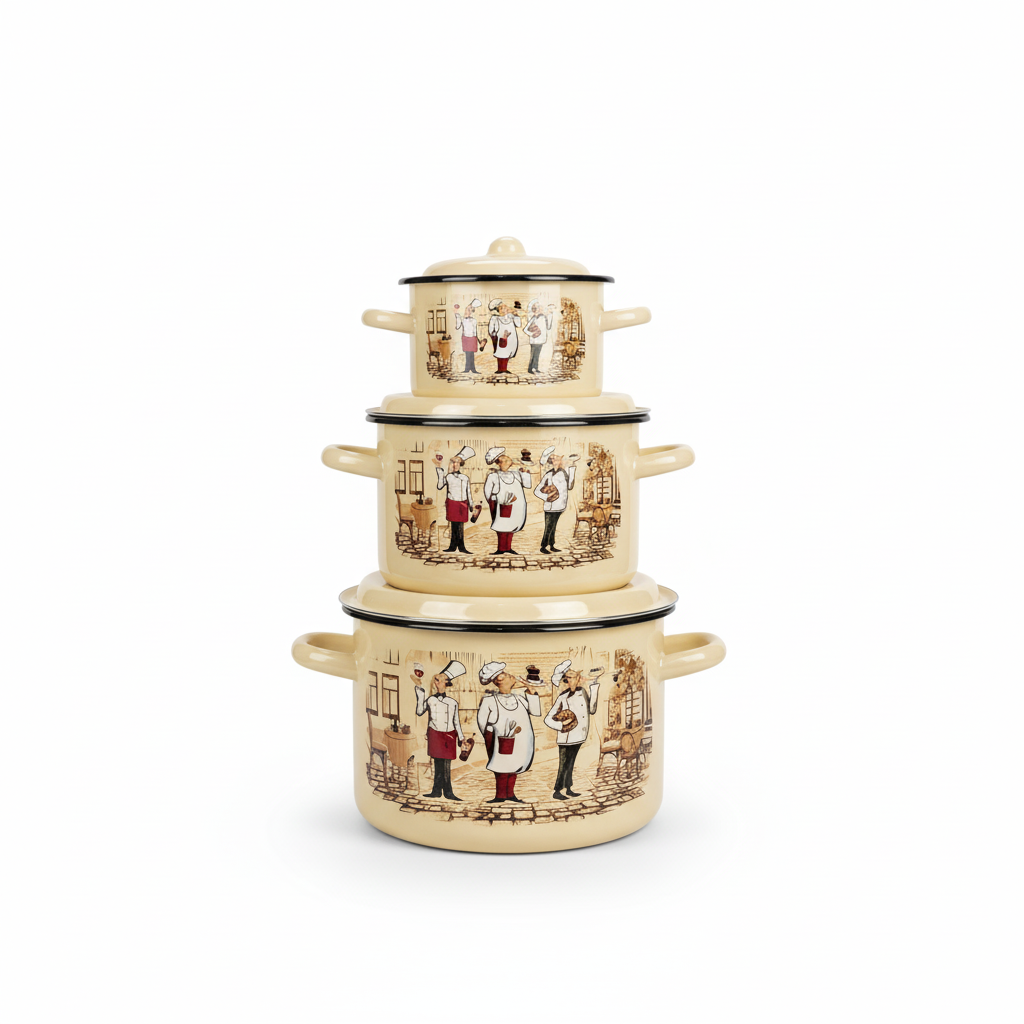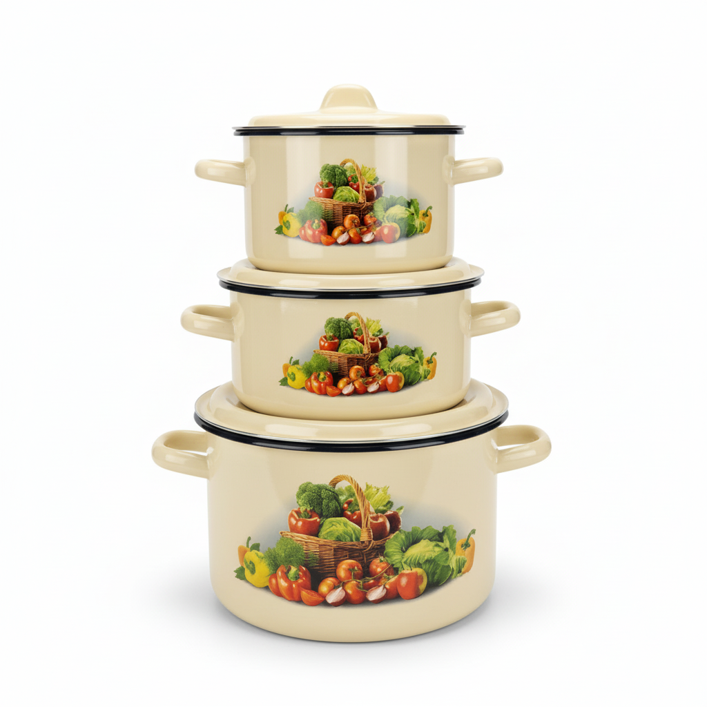 سرویس قابلمه ۶ پارچه لعابی ساخت روسیه با سایزهای ۱.۵، ۳ و ۴.۵ لیتر. بسیار ضخیم، بادوام، قابل استفاده روی شعله مستقیم و ماشین ظرفشویی، بدون تغییر رنگ و طرح.