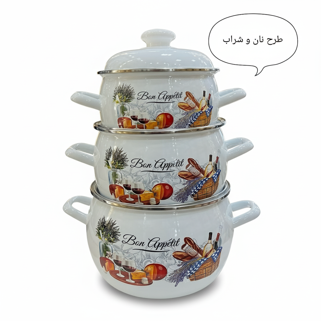 سرویس قابلمه ۶ پارچه لعابی قالب خمره ایی لب استیل ساخت روسیه با سایزهای ۲ ، ۳.۵ و ۵ لیتر. بسیار ضخیم، بادوام، قابل استفاده روی شعله مستقیم و ماشین ظرفشویی، بدون تغییر رنگ و طرح.