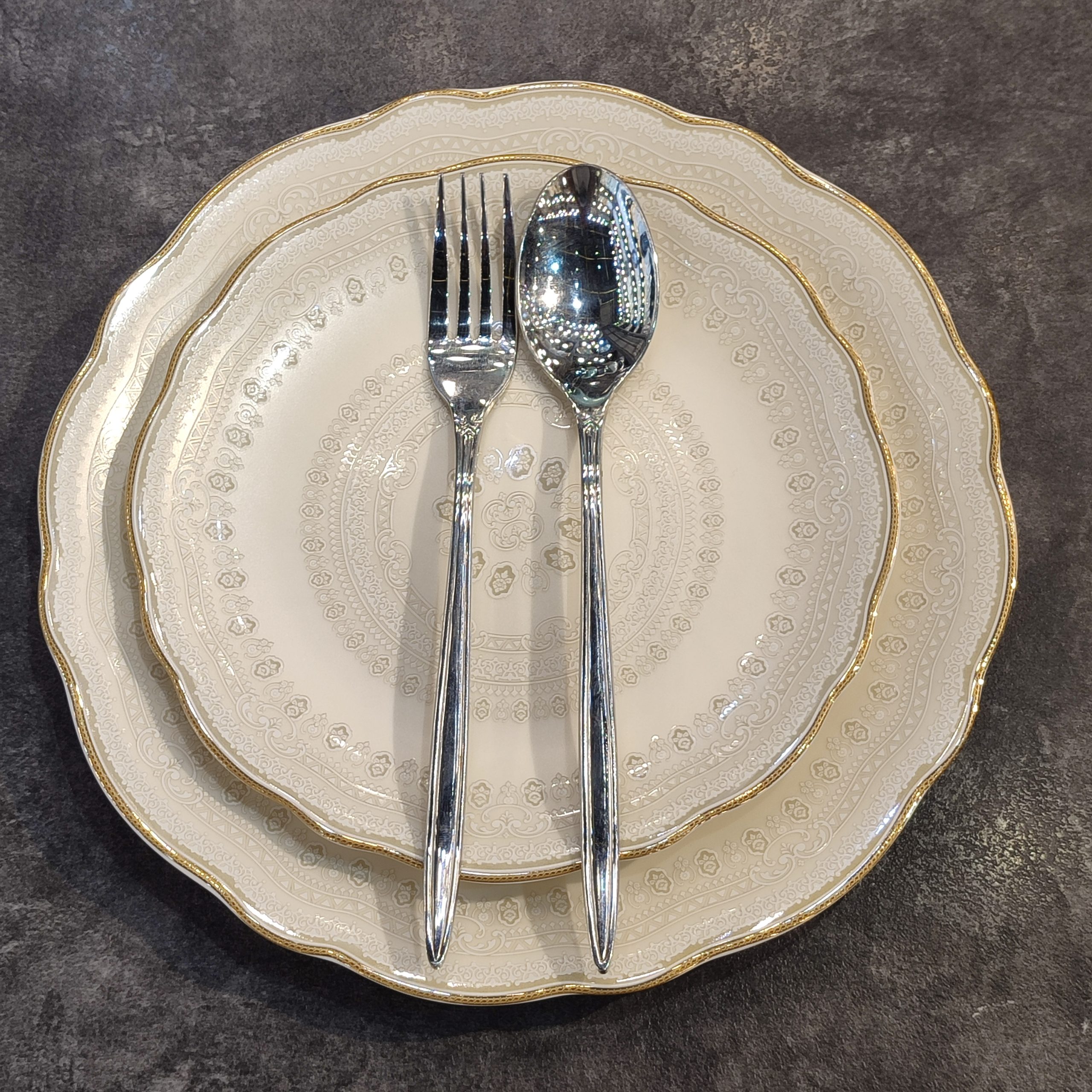 این طراحی با استفاده از متریال سلیس ایتالیایی و پلاتين صنعتی المانی انجام شده. این سرویس کاملا ضدخش و ضد لک میباشد وهمچنین بسیار سبک نیز می باشد. قالب ملبورن الهام گرفته از جدیدترین تکنولوژی روز دنیا از صنعت بن چاینا می باشد. چینی استخوانی الیزابت از لحاظ علم سرامیک محصولی بسیار سبک با قابلیت گذردهی نور بسیار شفاف وبا ضمانت ظرف شویی می باشد