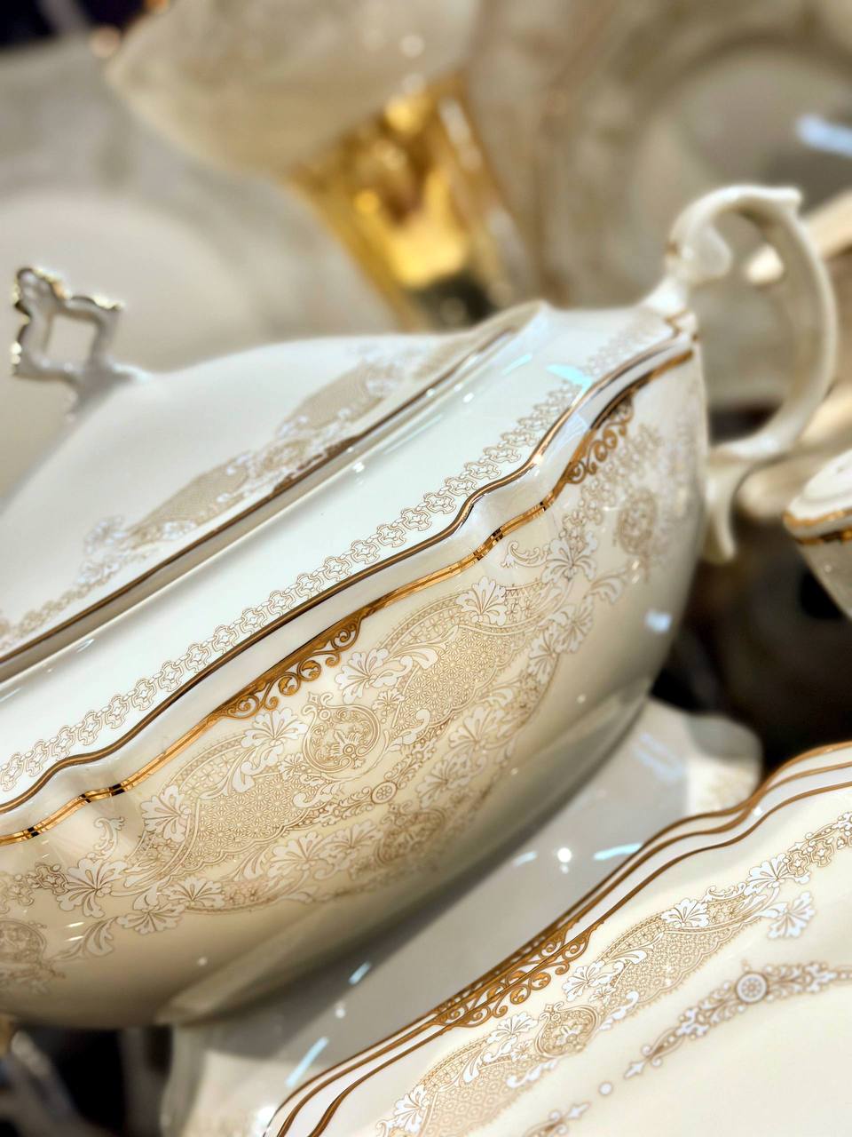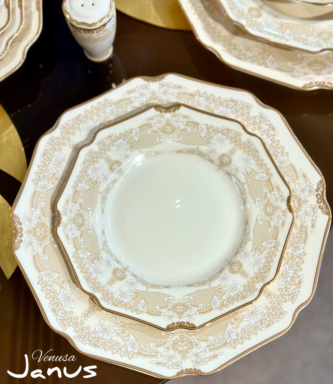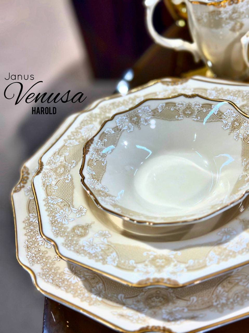 سرویس چینی ۱۸ نفره ژانوس با قالب زیبای ونوسا و طرح هارولد، سبک، منحصربهفرد و کامل از نظر آیتمبندی. ساخته شده با متریال نیوبن چاینا، مقاوم و قابل استفاده در ماشین ظرفشویی، انتخابی ایدهآل برای میزبانی روزمره و مجالس رسمی.
