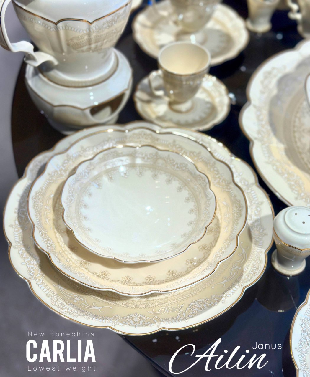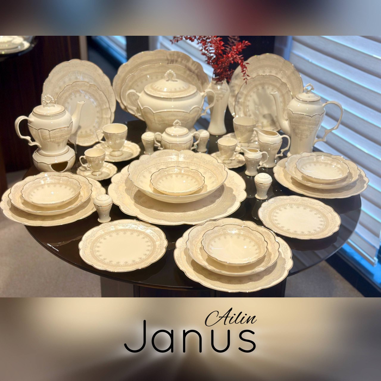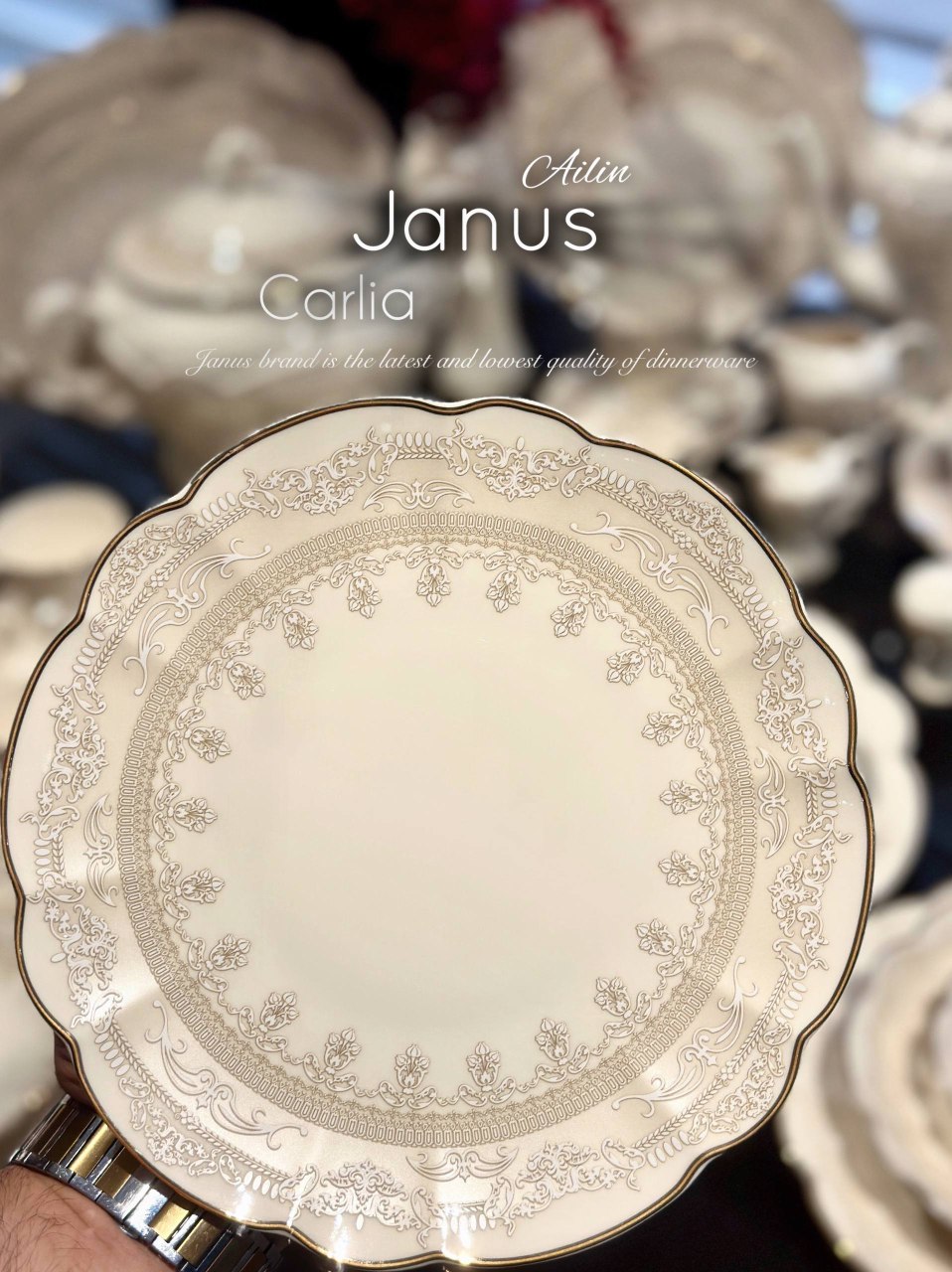 سرویس چینی ۱۸ نفره ژانوس با قالب زیبا آیلین و طرح کارلیا، سبک، منحصربهفرد و کامل از نظر آیتمبندی. ساخته شده با نیو بنچاینا، مقاوم و قابل استفاده در ماشین ظرفشویی، انتخابی ایدهآل برای میزبانی روزمره و مجالس رسمی.