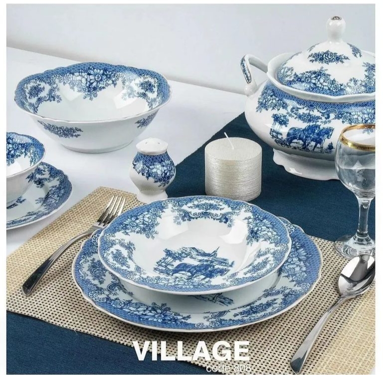 سرویس چینی ۳۰ پارچه پردیس کاشان طرح ویلیج با طراحی کلاسیک انگلیسی، رنگهای آبی و سورمهای، یادآور سرویسهای سلطنتی است؛ انتخابی محبوب و ایدهآل برای میزبانیهای رسمی