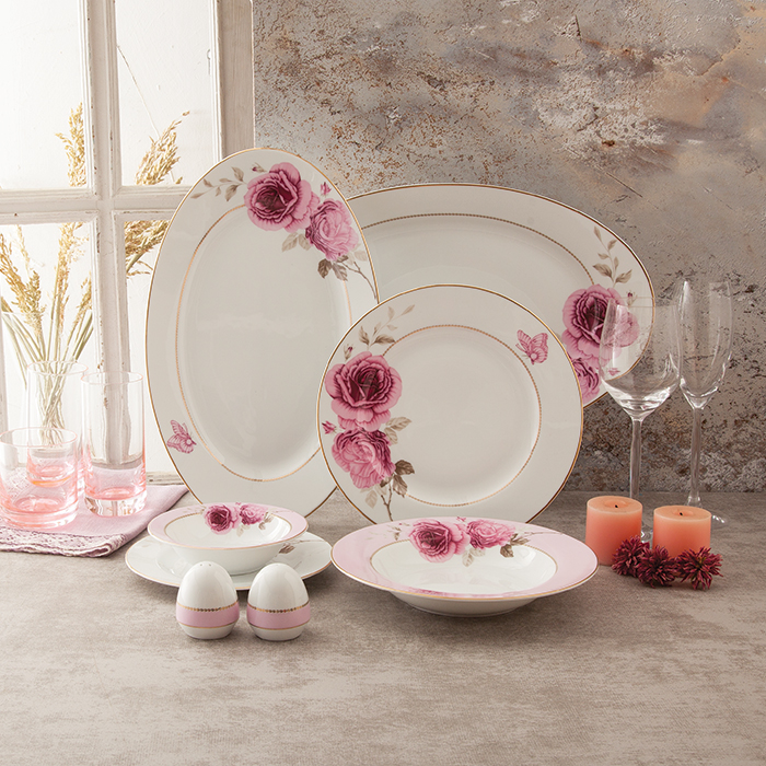 ظروف این سرویس از چینی درجه عالی و سبک تولید شدهاند و بشقابهای بزرگ ۲۷ سانتیمتری آن، فضای کافی برای سرو کامل غذا فراهم میکنند. طراحی خاص گلدار این محصول، انتخابی مناسب برای مهمانیها، مجالس رسمی و حتی استفاده روزمره است.