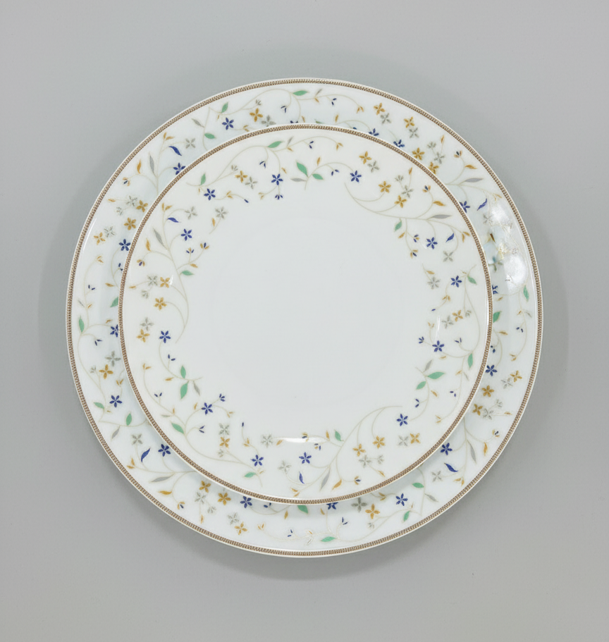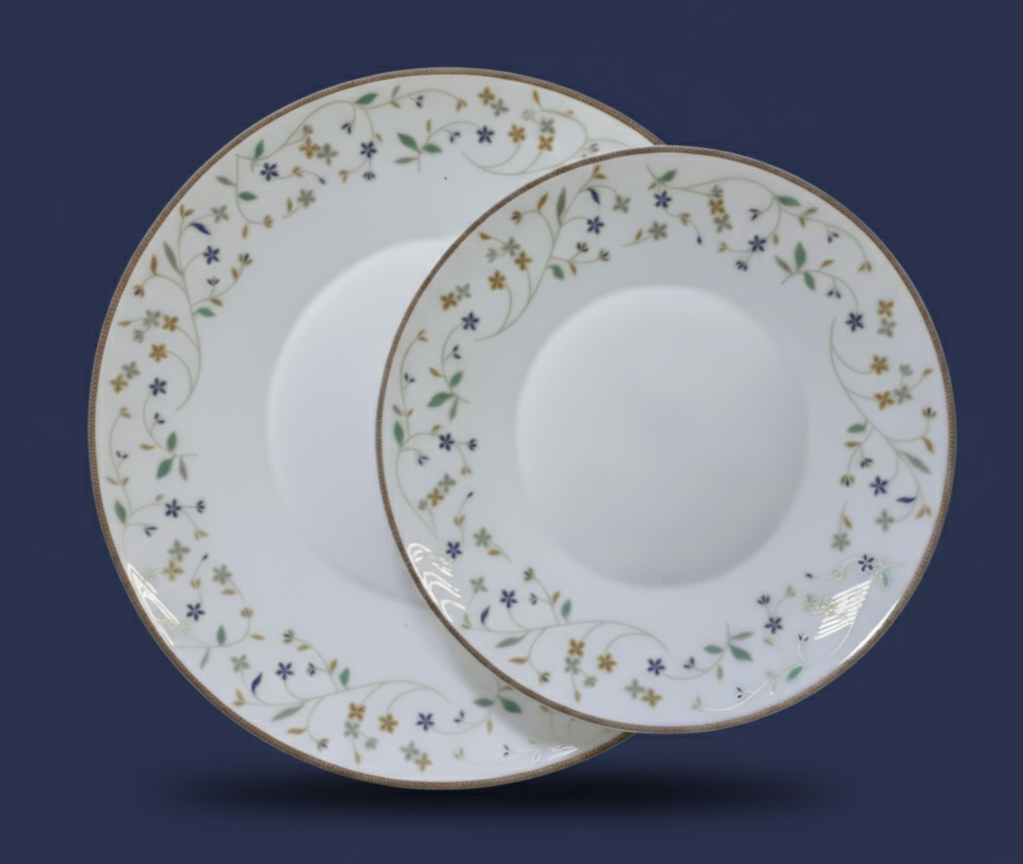 سرویس ۲۸ پارچه آرکوپال پارس اپال کد ۵۱۵ با طرح گل‌های آبی و طلایی، زیبا، مقاوم و مناسب ماشین ظرفشویی.