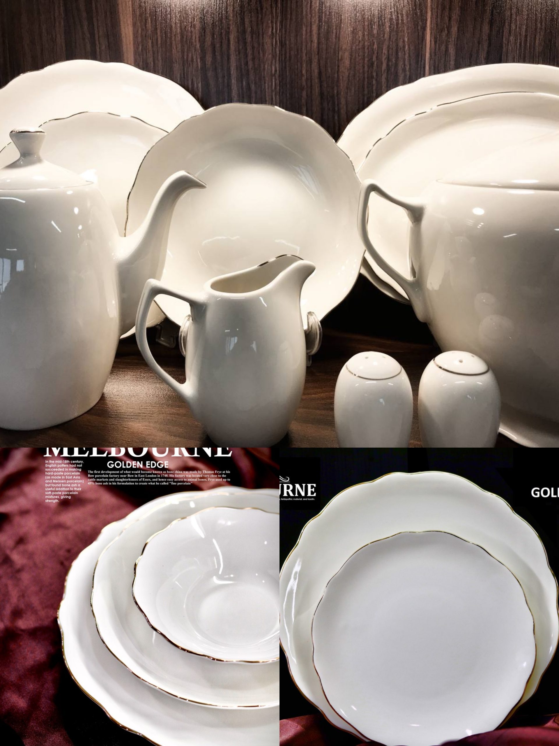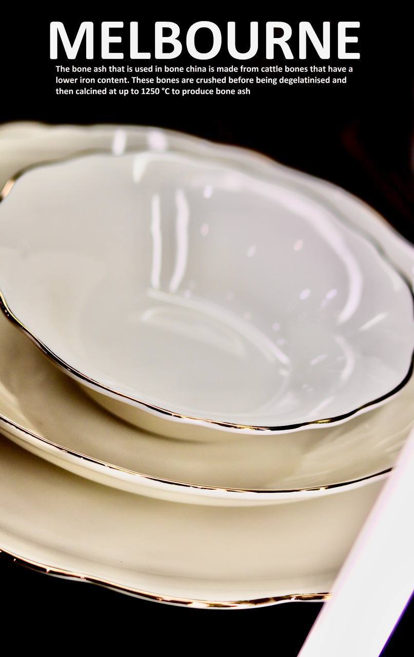 این طراحی با استفاده از متریال سلیس ایتالیایی و پلاتين صنعتی المانی انجام شده. این سرویس کاملا ضدخش و ضد لک میباشد وهمچنین بسیار سبک نیز می باشد. قالب ملبورن الهام گرفته از جدیدترین تکنولوژی روز دنیا از صنعت بن چاینا می باشد. چینی استخوانی الیزابت از لحاظ علم سرامیک محصولی بسیار سبک با قابلیت گذردهی نور بسیار شفاف وبا ضمانت ظرف شویی می باشد